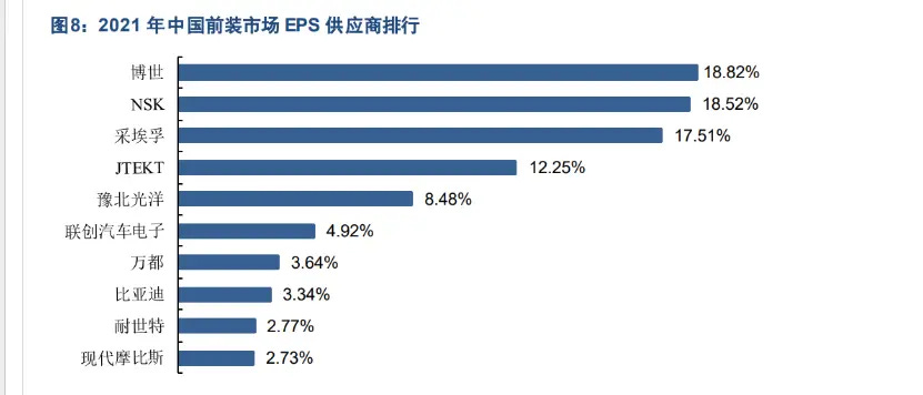 In important motor/driver/power/charging module related supply chain, the lists are almost always dominated by BYD/Fudi at top, followed by various domestic or JVs. And then there are things like EPS, EPB, air suspension & smart wheelbase. Here is a market share breakdown of EPS in 2021